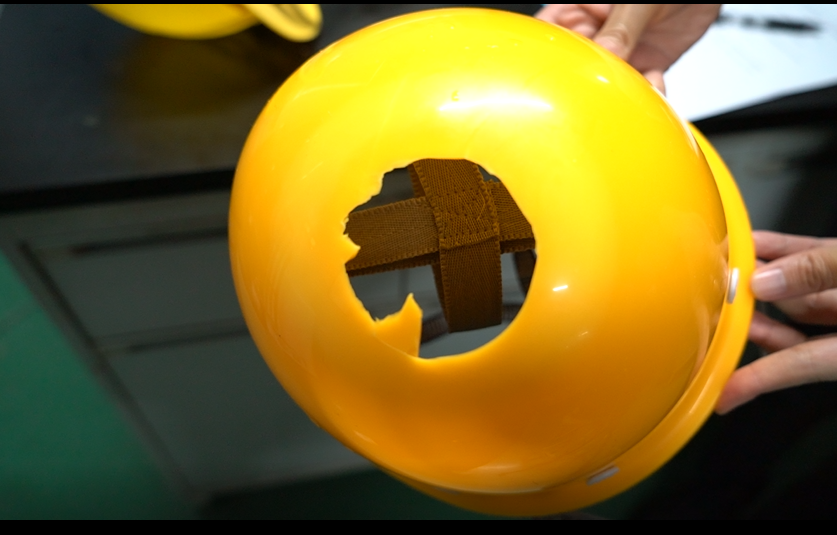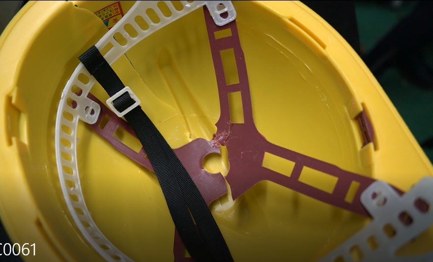記者注意到,15元這款帽經(jīng)過(guò)低溫預(yù)處理后測(cè)試,落錘砸中后頂部出現(xiàn)一個(gè)直徑超過(guò)5厘米的破洞,碎片四處飛濺?!斑@是標(biāo)準(zhǔn)所不允許的,碎片脫落會(huì)對(duì)佩戴者造成二次傷害?!痹S超說(shuō)。另一款較為典型的是8元帽,測(cè)試后帽殼內(nèi)部部件完全脫落,繞頭圍起固定作用的帽箍、設(shè)置在帽箍和帽殼之間吸收沖擊力的緩沖墊斷裂,“這是比較嚴(yán)重的斷裂?!贝送猓睔ひ渤霈F(xiàn)了裂紋,像被劈成兩半。