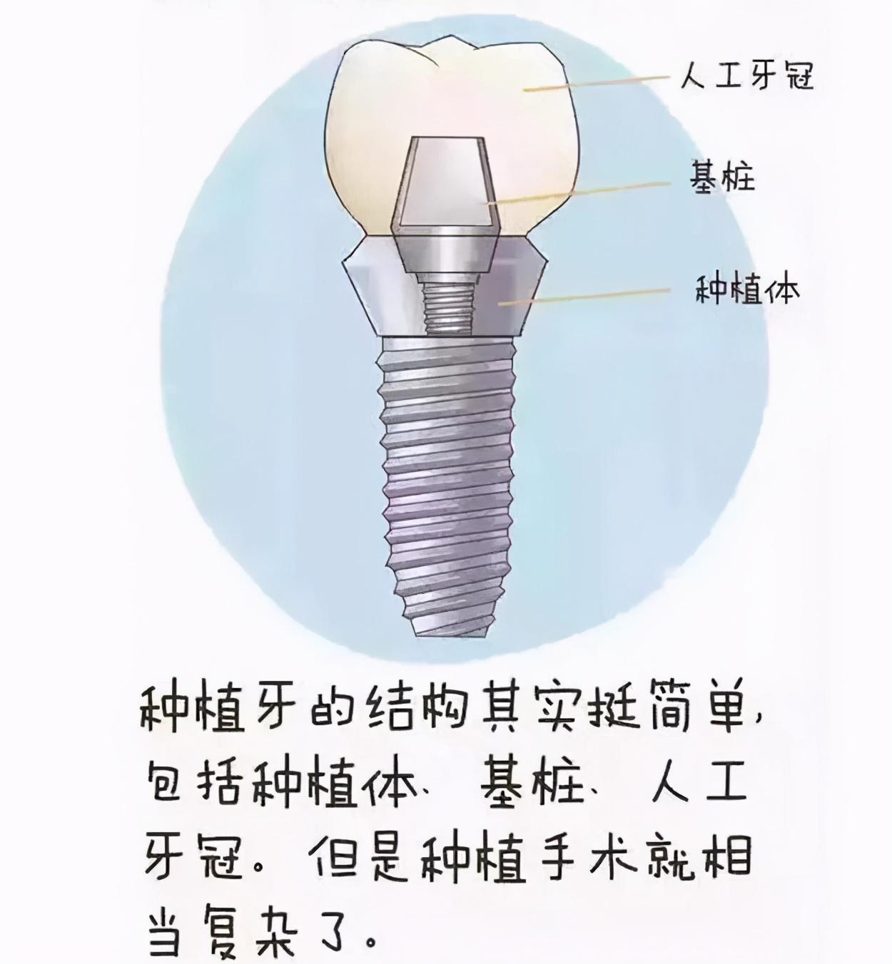 種植牙通俗來說,就是將人工材料制成的種植體,植入缺損部位的牙槽骨中,再套上人工牙冠,基本組成為:種植體+基臺(tái)+牙冠。