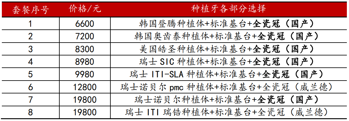 根據(jù)各口腔醫(yī)院的反饋,在種植牙套餐中,種植體由于要植入牙槽骨,消費(fèi)者出于的考慮,大多會(huì)優(yōu)先選擇大品牌及高價(jià)格的海外產(chǎn)品。