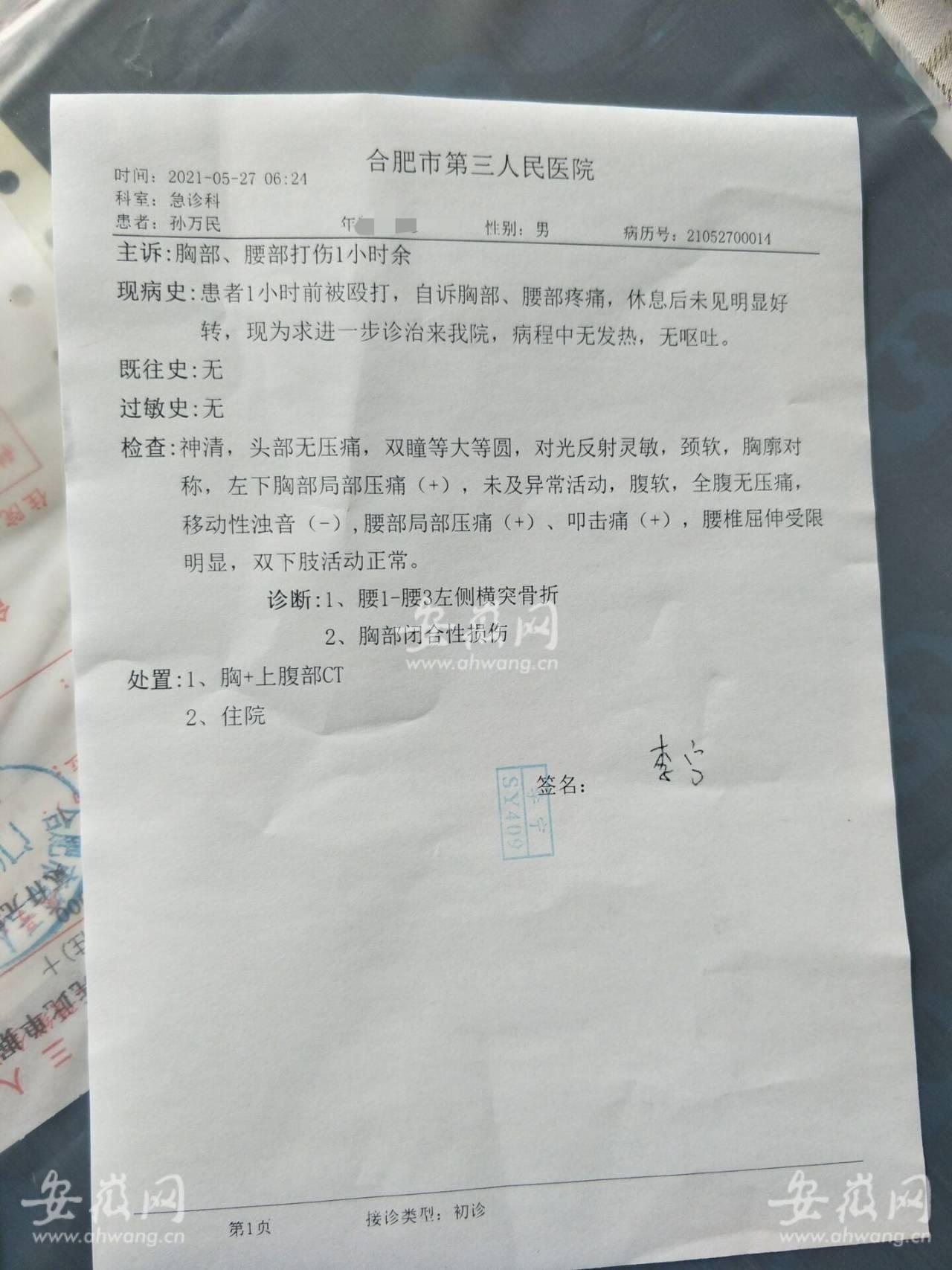 孫萬(wàn)民的病例顯示,他是5月27日早上6點(diǎn)多被送到合肥市第三人民醫(yī)院的?,F(xiàn)病史為:患者1小時(shí)前被毆打,自述胸部、腰部疼痛,休息后未見(jiàn)好轉(zhuǎn)。5月28日中午,孫萬(wàn)民的管床醫(yī)生陳醫(yī)生向新安晚報(bào)、安徽網(wǎng)、大皖新聞?dòng)浾呓榻B,目前傷者孫萬(wàn)民生命體征平穩(wěn),鼻部挫傷,經(jīng)過(guò)診斷左側(cè)5根(第三根到第七根)肋骨骨折,腰部左側(cè)1—3橫突骨折,胸部閉合性損傷,因?yàn)橥饬υ斐?;目前需要臥床、消腫、鎮(zhèn)痛對(duì)癥調(diào)節(jié),病情尚在進(jìn)一步觀察會(huì)診中,必要時(shí)要請(qǐng)相關(guān)科室進(jìn)一步處理。