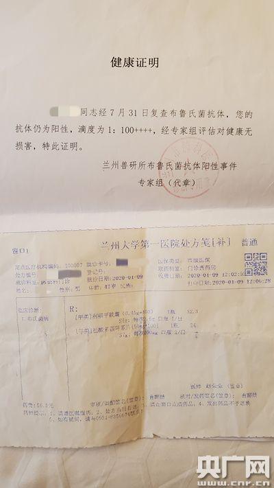 由蘭州大學(xué)第一醫(yī)院確診為布病患者的張先生也收到了和王女士一樣的由蘭州市專家組出具的健康證明——“經(jīng)7月31日復(fù)查布魯氏菌抗體,您的抗體仍為陽(yáng)性,滴度為1:100+++,經(jīng)專家組評(píng)估,對(duì)健康無(wú)損害,特此證明”。