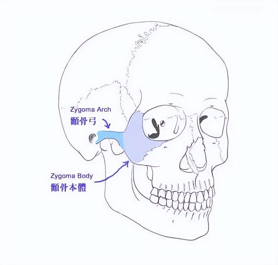 顴弓由兩塊骨骼組成,顴骨顳突與顳骨顴突結(jié)合形成的顴弓,位于顱面骨的兩側(cè),呈向外的弓形,上緣較銳利,易于捫及。顴骨及顴弓也是人體面形輪廓的重要構(gòu)成部分,改變其形狀和凸度可改變面部的外形。