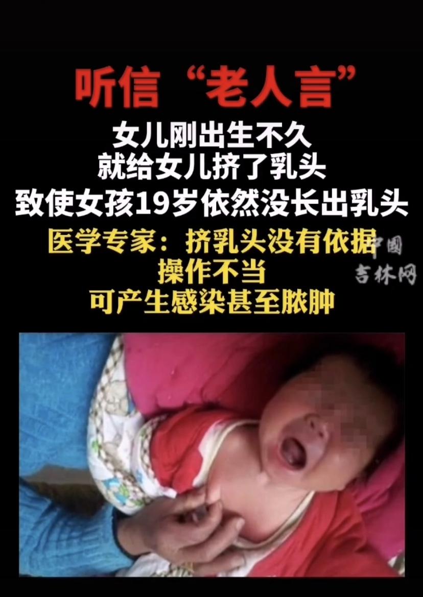 十九歲女孩因?yàn)榧议L(zhǎng)在其小時(shí)候?yàn)樗龜D乳頭,導(dǎo)致她長(zhǎng)不出乳頭之后,就有網(wǎng)友評(píng)論說道: 小時(shí)候還沒滿月,就被奶奶擠這個(gè)進(jìn)了醫(yī)院開刀,現(xiàn)在胸上還有疤。