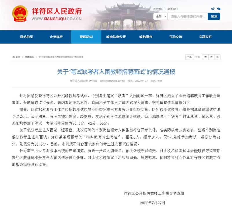 1、河南開封通報筆試缺考者入圍教師招聘面試 針對網(wǎng)傳河南省開封市祥符區(qū)公開招聘教師考試,個別考生筆試“缺考”入圍面試一事,祥符區(qū)人民政府門戶網(wǎng)站27日發(fā)布情況通報稱,此次招教考務(wù)工作由區(qū)招教考試領(lǐng)導(dǎo)小組委托第三方考務(wù)公司組織實施。經(jīng)復(fù)核,發(fā)現(xiàn)個別考生成績統(tǒng)計錯誤,公示成績顯示“缺考”的江某某、彭某某、聶某某均參加了筆試,成績分別為35.5分、62分、55分。經(jīng)調(diào)查,此次招聘的個別崗位報考人數(shù)雖然符合開考條件,但實際缺考人數(shù)較多,出現(xiàn)個別崗位低分數(shù)考生進入面試。針對第三方公司考務(wù)中出現(xiàn)的嚴重問題,待進一步深入調(diào)查后,依法依規(guī)予以追責。對此次招教考試中未能履行好監(jiān)管職責的區(qū)教體局相關(guān)責任人依紀依法進行處理。