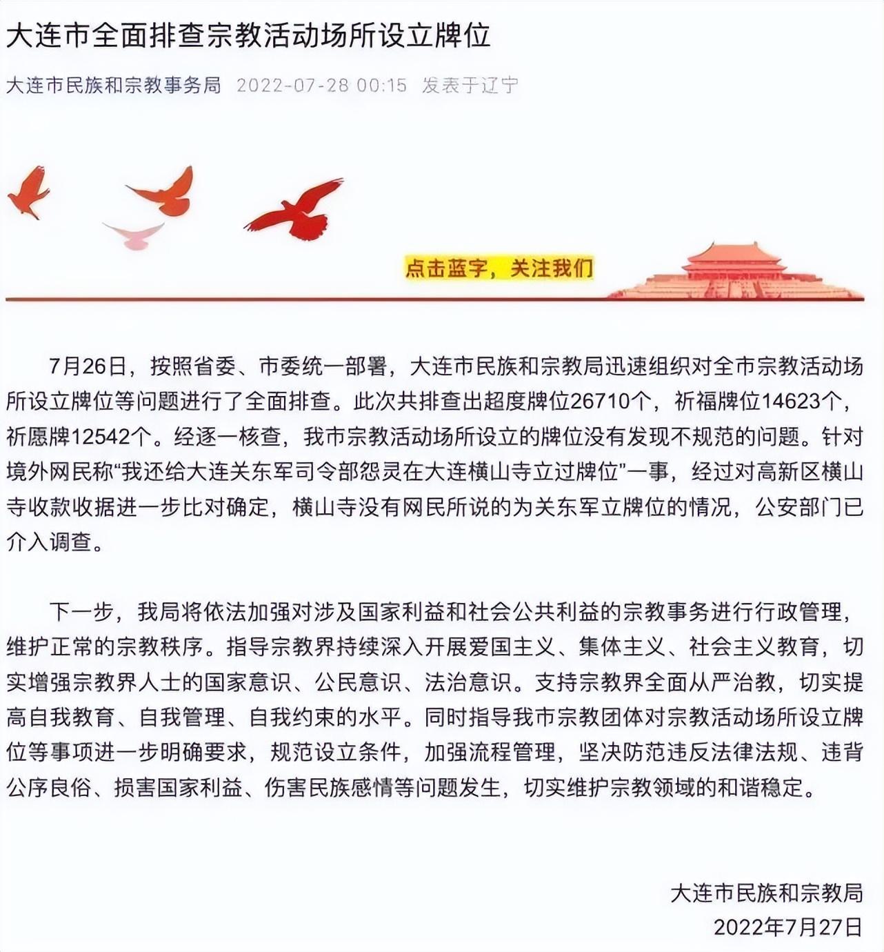 7月26日,按照省委、市委統(tǒng)一部署,大連市民族和宗教局迅速組織對全市宗教活動場所設(shè)立牌位等問題進行了排查。此次共排查出超度牌位26710個,祈福牌位14623個,祈愿牌12542個。經(jīng)逐一核查,我市宗教活動場所設(shè)立的牌位沒有發(fā)現(xiàn)不規(guī)范的問題。針對境外網(wǎng)民稱“我還給大連關(guān)東軍司令部怨靈在大連橫山寺立過牌位”一事,經(jīng)過對高新區(qū)橫山寺收款收據(jù)進一步比對確定,橫山寺沒有網(wǎng)民所說的為關(guān)東軍立牌位的情況,公安部門已介入調(diào)查。