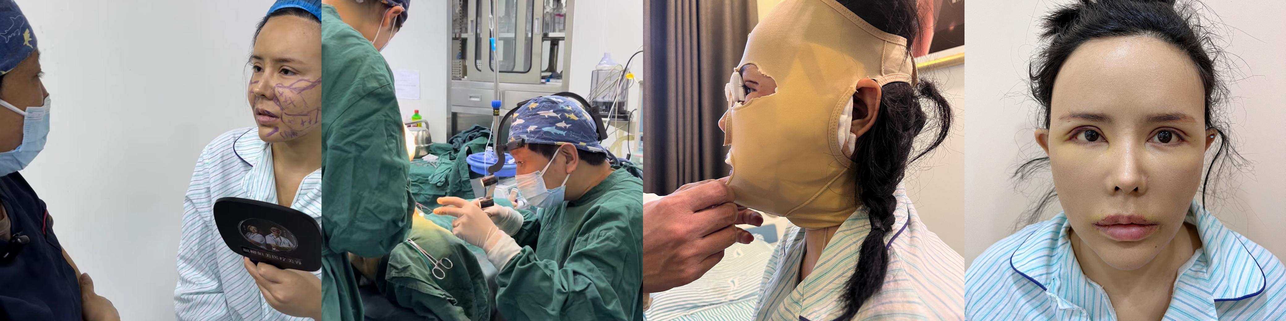 第一張是面診的時(shí)候,第二張是手術(shù)中,第三張是術(shù)后范院長教我戴面罩,第四張是現(xiàn)在,面部還有些緊繃,但比一開始已經(jīng)好很多了。