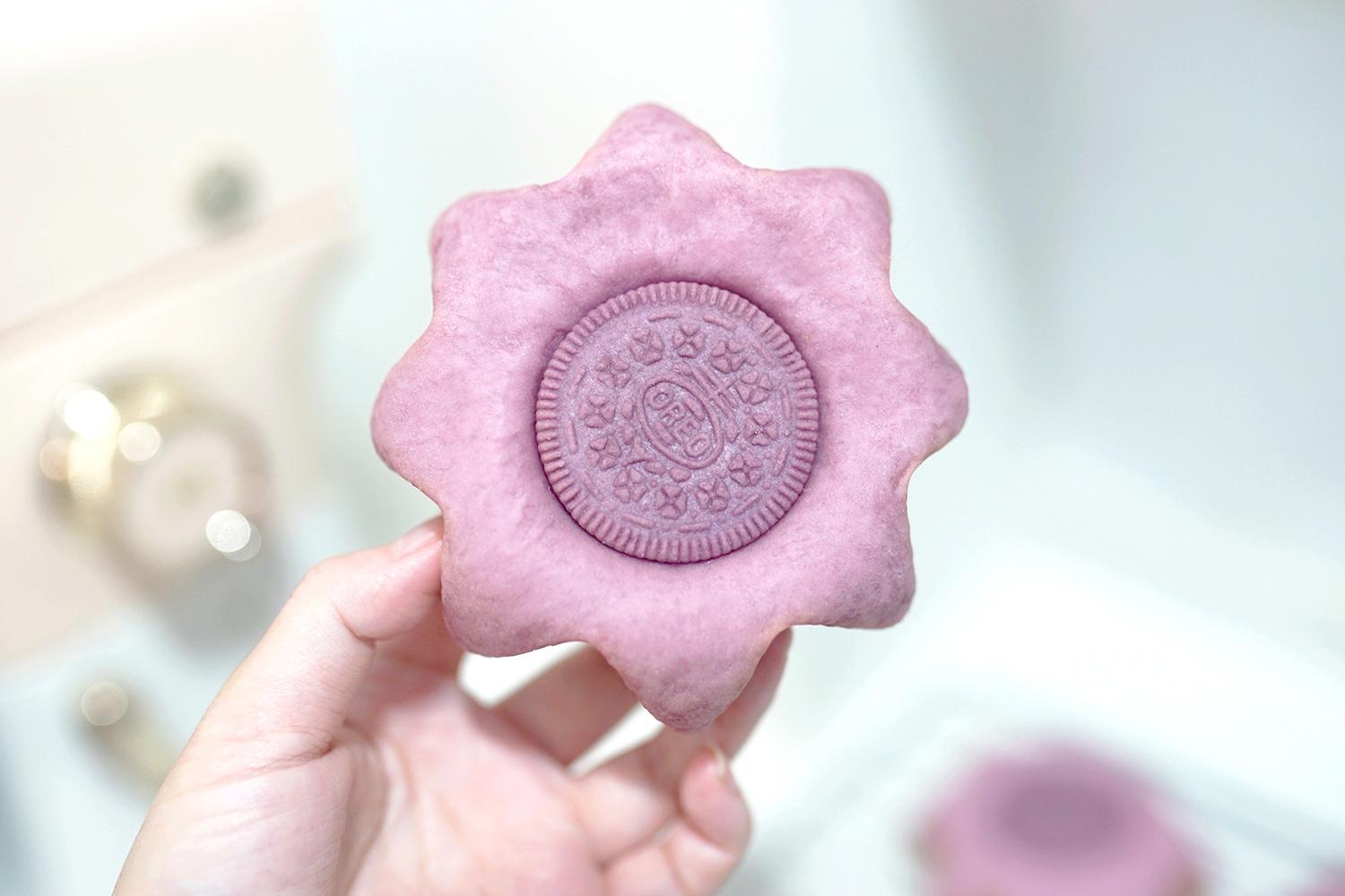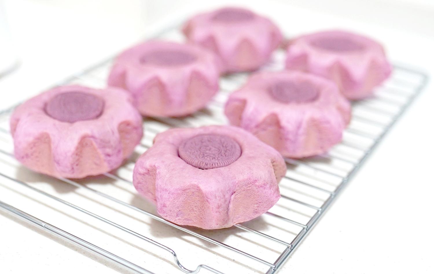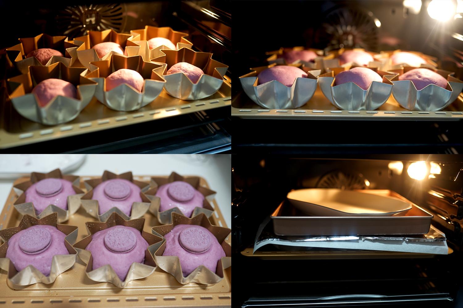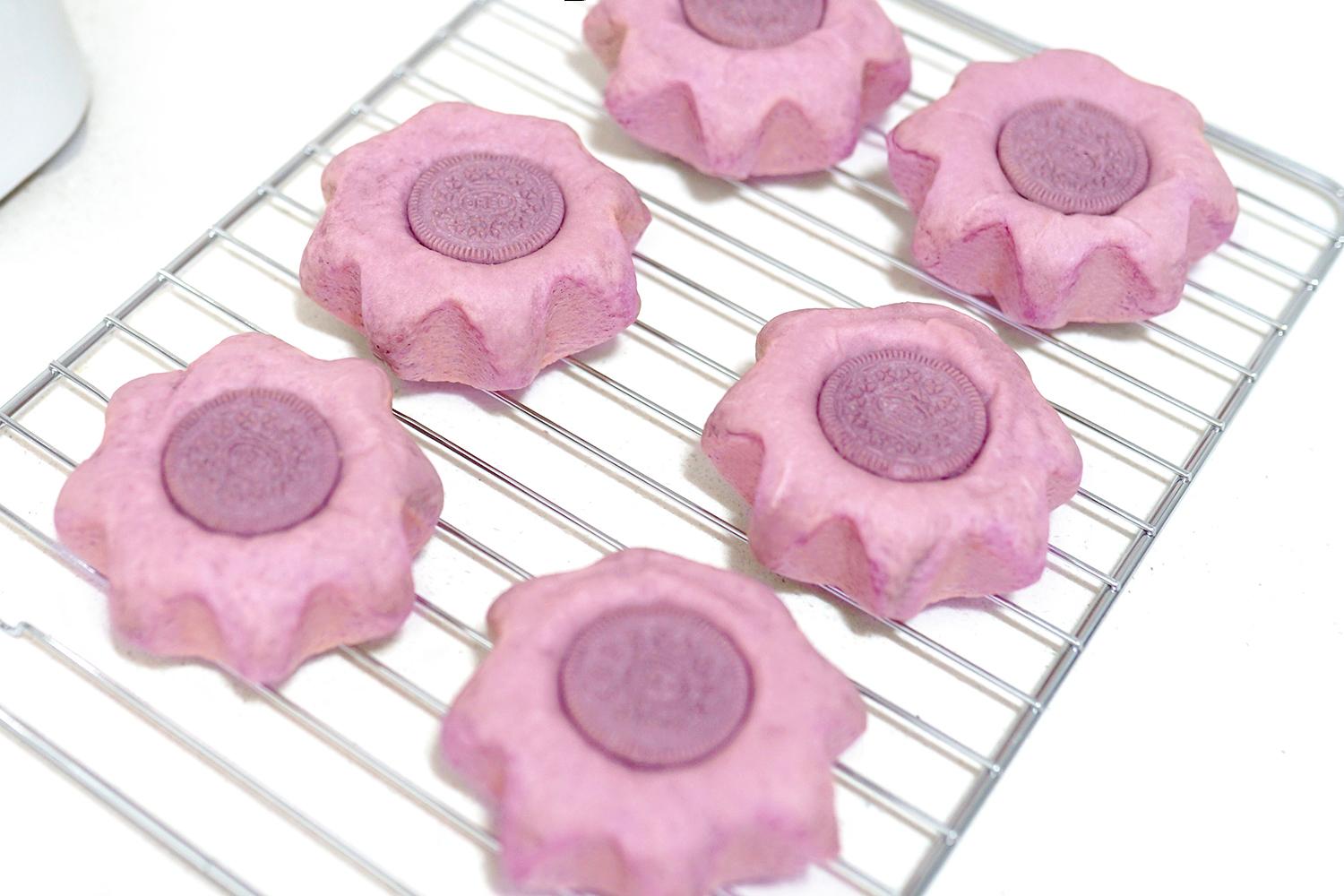 ?發(fā)酵好之后,在面團(tuán)表面噴少許水霧,貼上一片紫色奧利奧餅干。