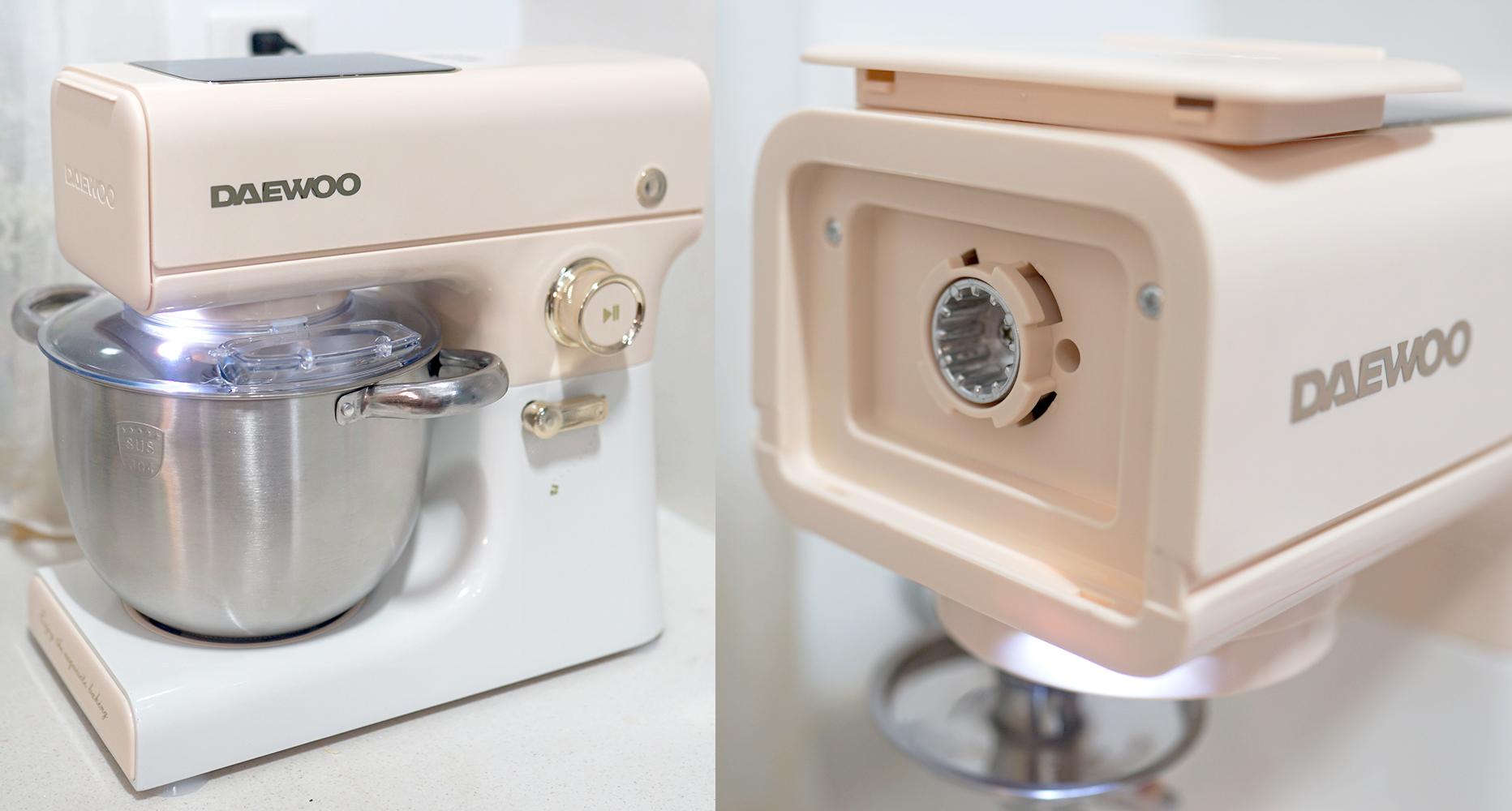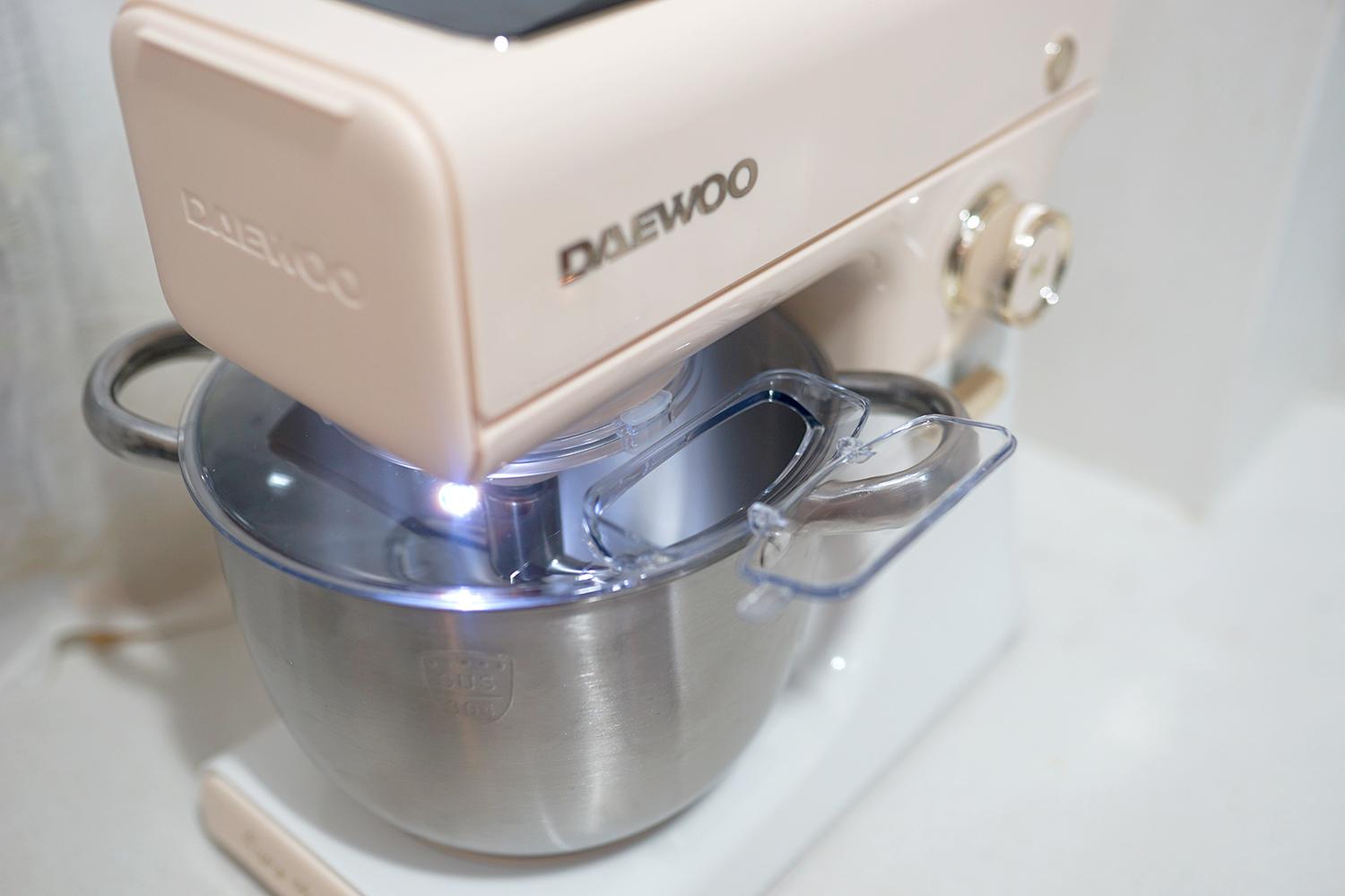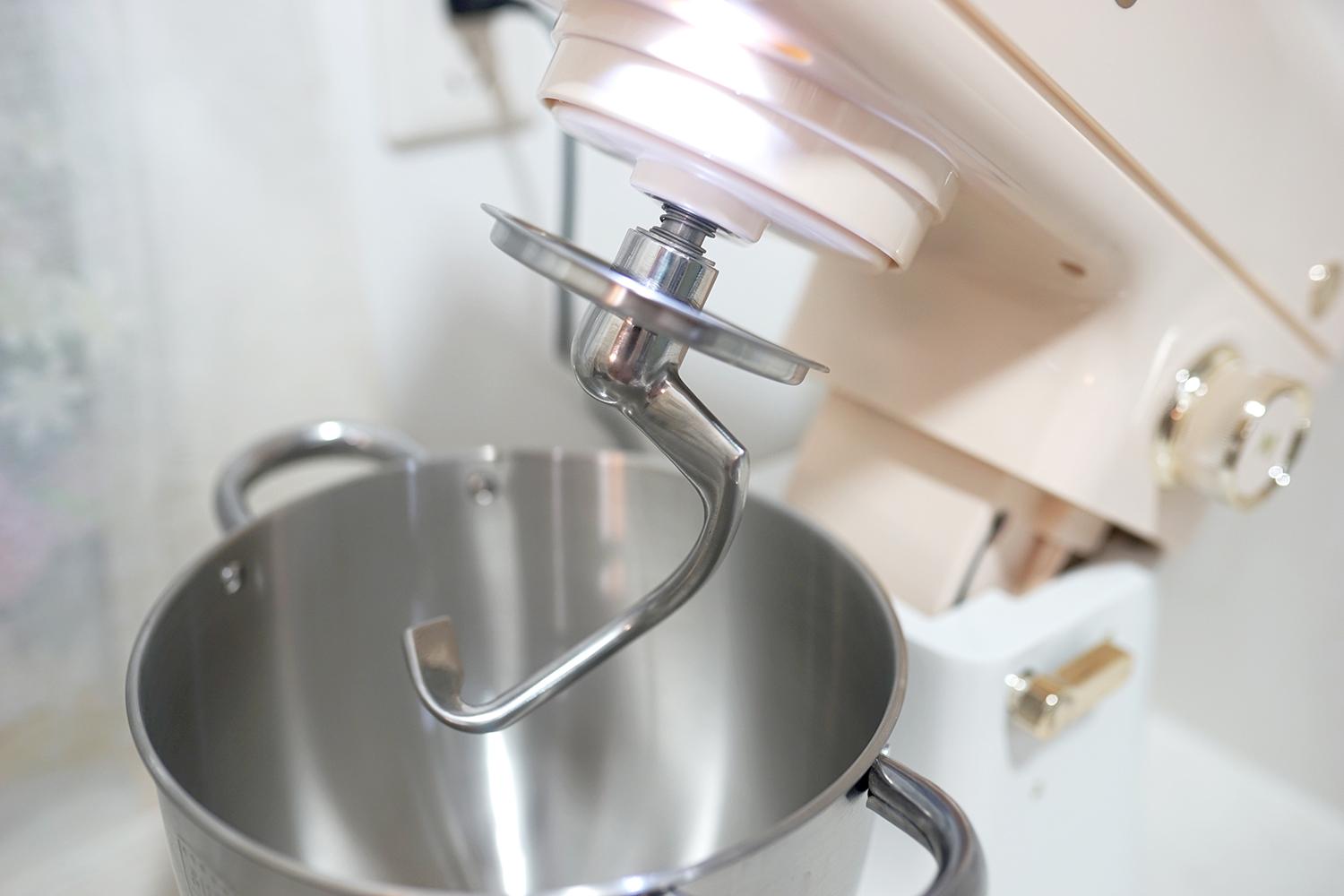 比如我家這款大宇廚師機(jī),它是在和面鉤頂部加設(shè)了一個防塵蓋,就是那個圓形的鐵片片,會有防止雜物掉落到攪拌盆里。