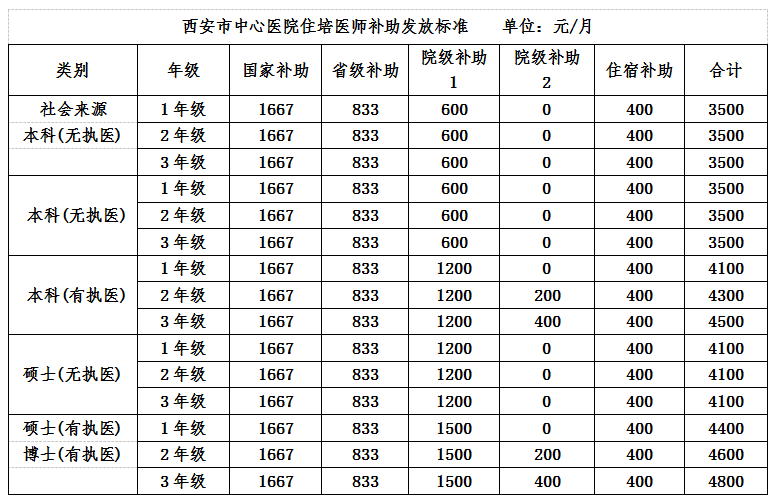西安市中心醫(yī)院住培醫(yī)師補(bǔ)助發(fā)放標(biāo)準(zhǔn) 單位:元/月