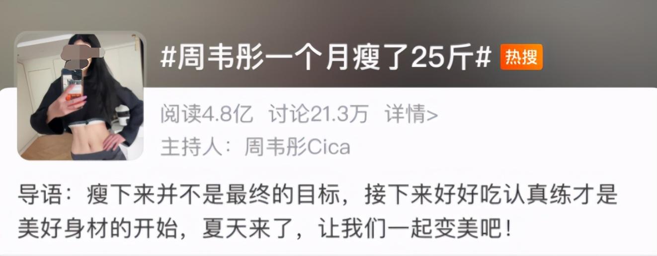 前段時(shí)間,模特周韋彤宣布瘦身成功,“周韋彤一個(gè)月瘦了25斤”的熱搜引來近5億人圍觀。