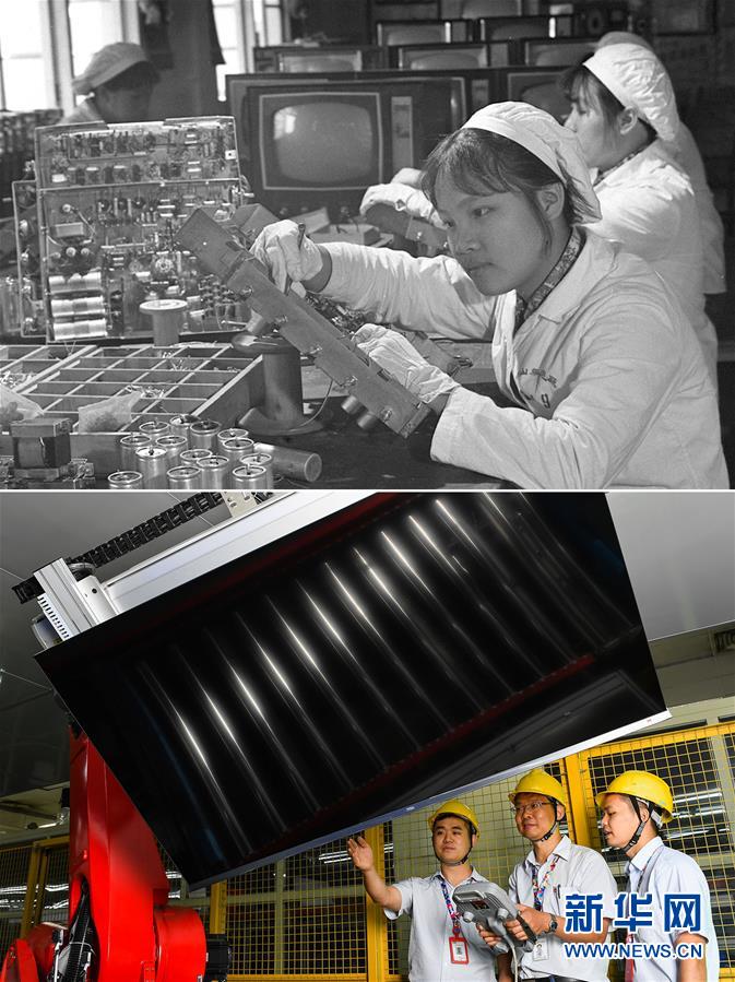 拼版照片:上圖為1975年,廣東中山無線電廠工人在裝配電視機(jī)(資料照片);下圖為2019年6月11日,在廣東惠州,TCL電子高級工程師張琪(中)在TCL AI電視生產(chǎn)線上測試機(jī)器人工作狀況(新華社記者劉大偉攝)。