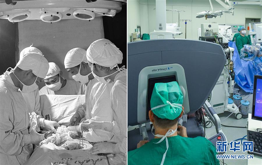 拼版照片:左圖為1975年,在廣東中山,衛(wèi)生院的外科大夫在為病人做膽切除手術(shù)(資料照片);右圖為2019年7月18日,在位于廣東廣州的中山大學(xué)附屬第一醫(yī)院,泌尿外科主任陳凌武教授(左)運(yùn)用“機(jī)器人輔助腹腔鏡”進(jìn)行一臺輸卵管狹窄整形手術(shù)(新華社記者劉大偉攝)。
