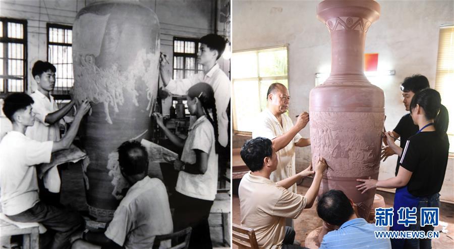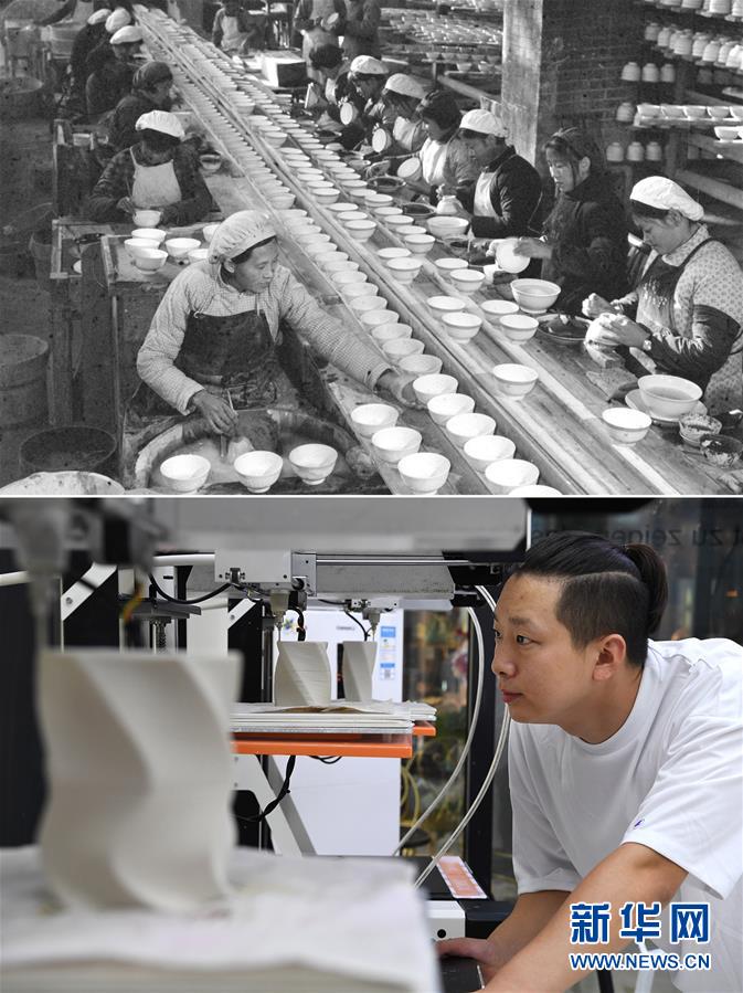 拼版照片:上圖為1978年,江西景德鎮(zhèn)為民瓷廠工人在生產(chǎn)日用瓷(資料照片);下圖為2019年7月26日,在江西景德鎮(zhèn)陶溪川文創(chuàng)街區(qū)的陶瓷3D打印體驗(yàn)中心,工作人員黃旭用3D打印技術(shù)制作陶瓷花瓶(新華社記者萬象攝)。