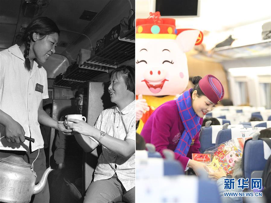 拼版照片:左圖為1977年,河北石家莊分局石家莊列車段的列車員邸敬茹為乘客送熱水(新華社記者朱力攝);右圖為2019年1月21日,在重慶西開往廣州南的D1867次列車上,列車員在車廂內(nèi)為旅客送上新春祝福(包亮攝)。