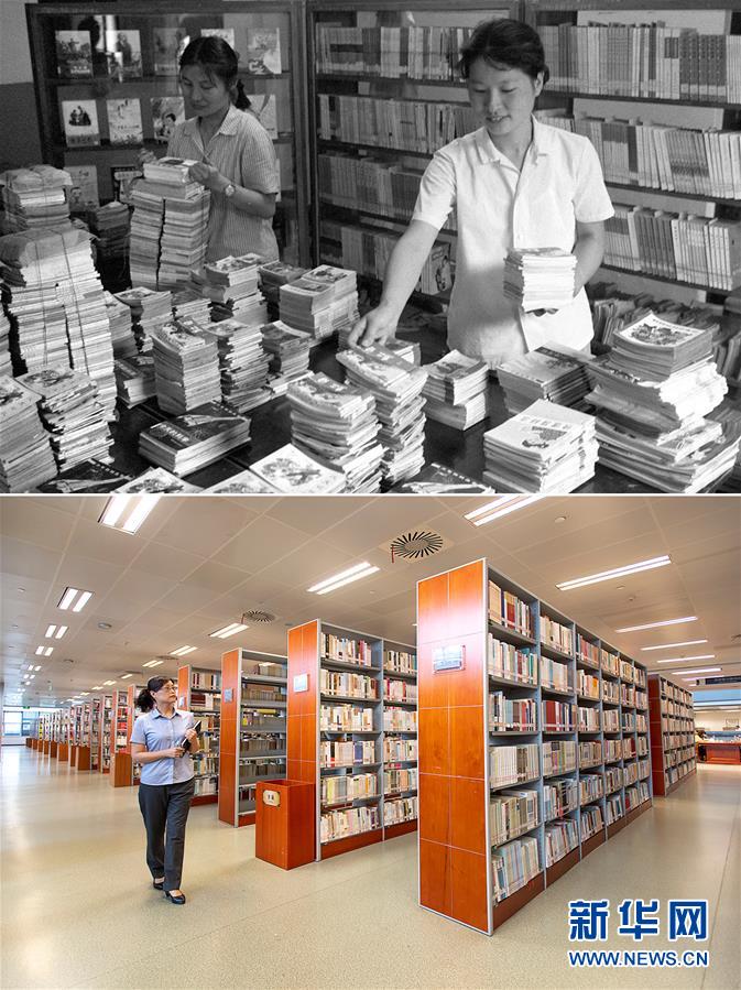 拼版照片:上圖為1979年,湖北省武漢市少年兒童圖書館工作人員為小讀者準(zhǔn)備暑期兒童讀物(新華社記者張申明攝);下圖為2019年6月21日,湖北省圖書館工作人員何菁在借閱區(qū)巡查(新華社記者熊琦攝)。