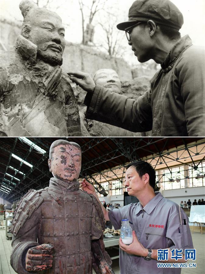 拼版照片:上圖為1974年,時(shí)任秦始皇兵馬俑考古隊(duì)領(lǐng)隊(duì)的袁仲一在陜西西安兵馬俑一號坑發(fā)掘現(xiàn)場進(jìn)行文物清理工作(秦始皇帝陵博物院提供);下圖為2019年7月4日,秦始皇帝陵博物院文物保護(hù)部副研究員蘭德省在兵馬俑一號坑修復(fù)現(xiàn)場對新修復(fù)的兵馬俑進(jìn)行彩繪加固保護(hù)(新華社記者李一博攝)。
