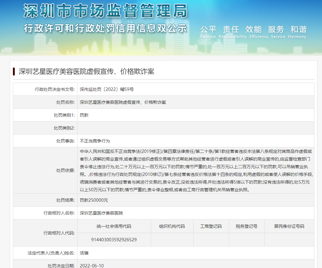 6月10日,深市監(jiān)處罰〔2022〕稽59號行政處罰決定書顯示,深圳藝星醫(yī)療美容醫(yī)院因虛假宣傳、價格欺詐,被深圳市市場監(jiān)督管理局罰款25萬元。處罰依據(jù)顯示,《反不正當(dāng)競爭法(2019修正)》第四章第二十條第1款,經(jīng)營者違反本法第八條規(guī)定對其商品作虛假或者引人誤解的商業(yè)宣傳,或者通過組織虛假交易等方式幫助其他經(jīng)營者進(jìn)行虛假或者引人誤解的商業(yè)宣傳的,由監(jiān)督檢查部門責(zé)令停止違法行為,處二十萬元以上一百萬元以下的罰款;情節(jié)嚴(yán)重的,處一百萬元以上二百萬元以下的罰款,可以吊銷營業(yè)執(zhí)照。另外,《價格違法行為行政處罰規(guī)定(2010修訂)》第七條規(guī)定,經(jīng)營者違反《價格法》第十四條的規(guī)定,利用虛假的或者使人誤解的價格手段,誘騙消費者或者其他經(jīng)營者與其進(jìn)行交易的,責(zé)令改正,沒收違法所得,并處違法所得5倍以下的罰款;沒有違法所得的,處5萬元以上50萬元以下的罰款;情節(jié)嚴(yán)重的,責(zé)令停業(yè)整頓,或者由工商行政管理吊銷營業(yè)執(zhí)照。