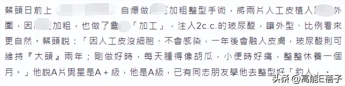 話是這么說,之后蔡頭還做了下體增大手術,在節(jié)目上炫耀自己洗三溫暖時超有自信……