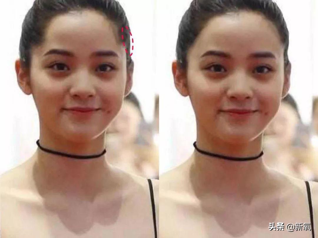 正確答案,歐陽娜娜其實(shí)是顳部太窄,她的問題是骨相上的問題,而非太陽穴軟組織上的問題。略微顯太陽穴凹的發(fā)際線反而能幫她加寬顳部。