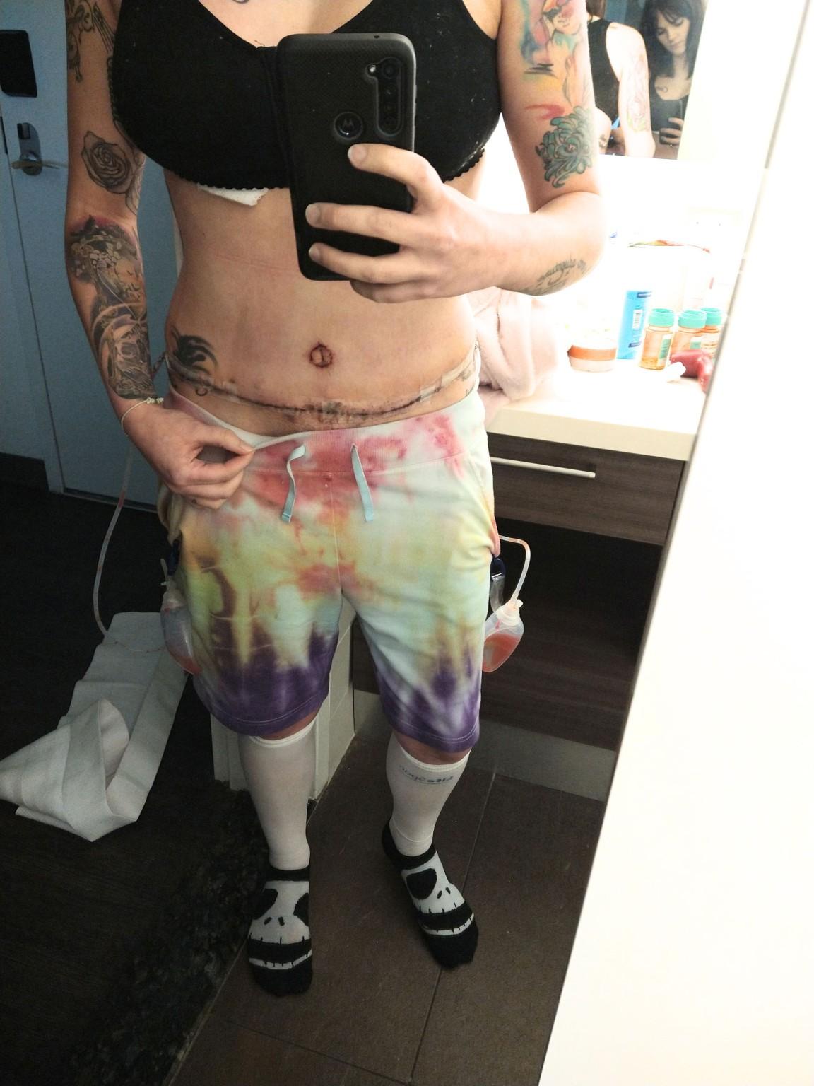 傷口上有密密麻麻的縫線,不斷有血從里面滲出來。到處是瘀傷和血塊,肚臍看上去特別大,像一個硬幣投口,周圍的皮膚則繃得異常緊。米爾斯傻了。她全身檢查了一番,發(fā)現(xiàn)情況還要更糟,右側(cè)乳房的乳頭和乳暈分離,出現(xiàn)一個特別大的黑痂,用她的話說“看著像黑洞”。兩個乳房也變大了,米爾斯感覺到里面多了胸部植入物,頂著自己的鎖骨。
