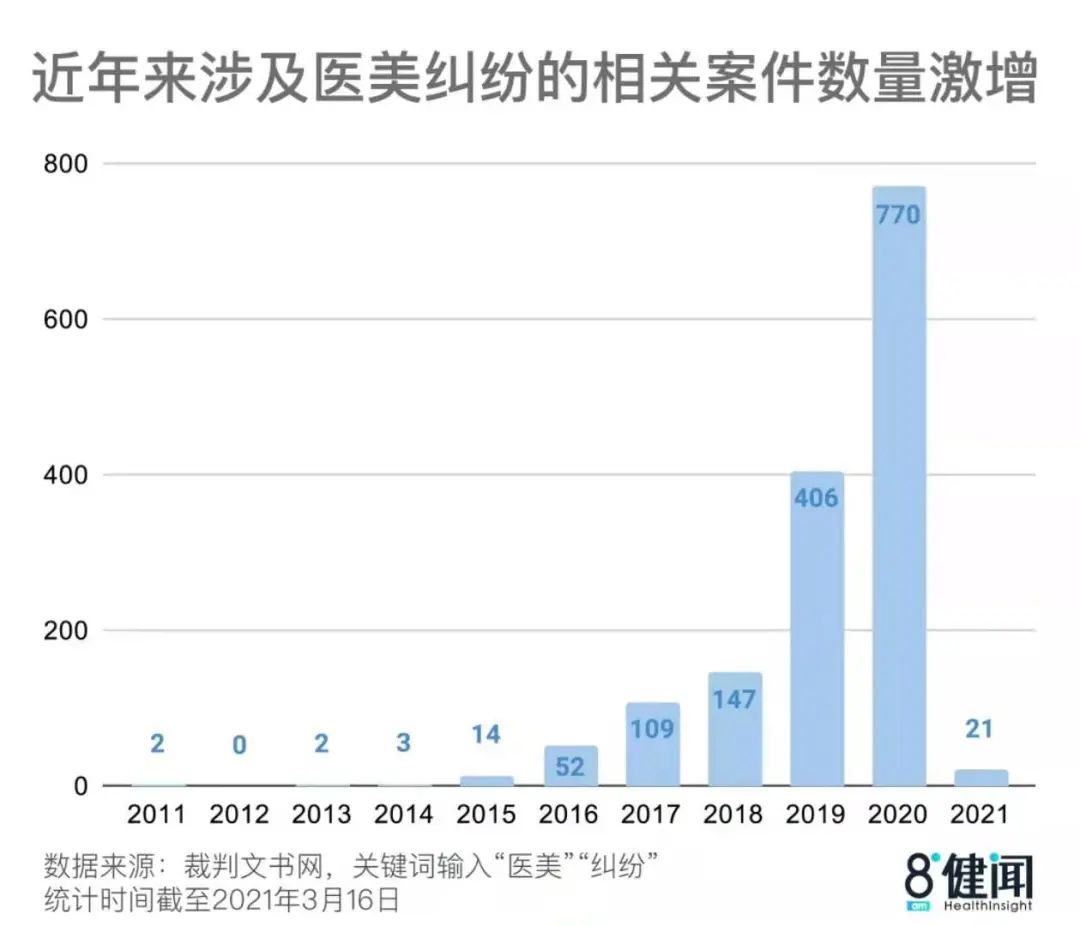圖據(jù)八點健聞3月15日,北京朝陽區(qū)法院發(fā)布了《北京朝陽區(qū)人民法院醫(yī)療美容糾紛案件民事審判白皮書》(2016年度-2020年度)。數(shù)據(jù)顯示,5年間,朝陽區(qū)法院受理的醫(yī)美糾紛案件數(shù)占同期醫(yī)療糾紛案件數(shù)比例逐年上升,該項數(shù)字由2016年的10.8%已經(jīng)上升至27.0%。其中虛假宣傳、非法行醫(yī)是涉訴醫(yī)美機構(gòu)的兩大突出問題。對此,朝陽法院向衛(wèi)健委發(fā)送司法建議,提高罰款上限,對嚴重違法違規(guī)的醫(yī)療美容機構(gòu)堅決吊銷取締,對嚴重違法的相關(guān)單位或個人實行終身禁醫(yī)制。