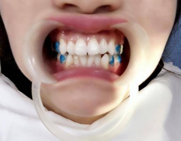 牙套做好后,醫(yī)生給我做了片切,還粘了附件(就在上圖涂藍色的牙齒上面)。據(jù)說這些精細的工作考驗醫(yī)生的技術(shù),我發(fā)現(xiàn)我的醫(yī)生操作起來熟練。我的牙齒也沒有覺得有啥敏感或不舒服的,全程都可以接受。
