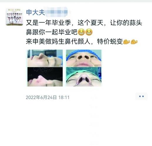 半個月后,大學(xué)生畢業(yè)季?!坝质且荒戤厴I(yè)季,這個夏天,讓你的蒜頭鼻跟你一起畢業(yè)吧。來申美做媽生鼻代顏人,特價蛻變?!?月24日,長沙火車站附近的申美醫(yī)療美容醫(yī)院“吹響”大學(xué)生畢業(yè)整形季的“號角”。
