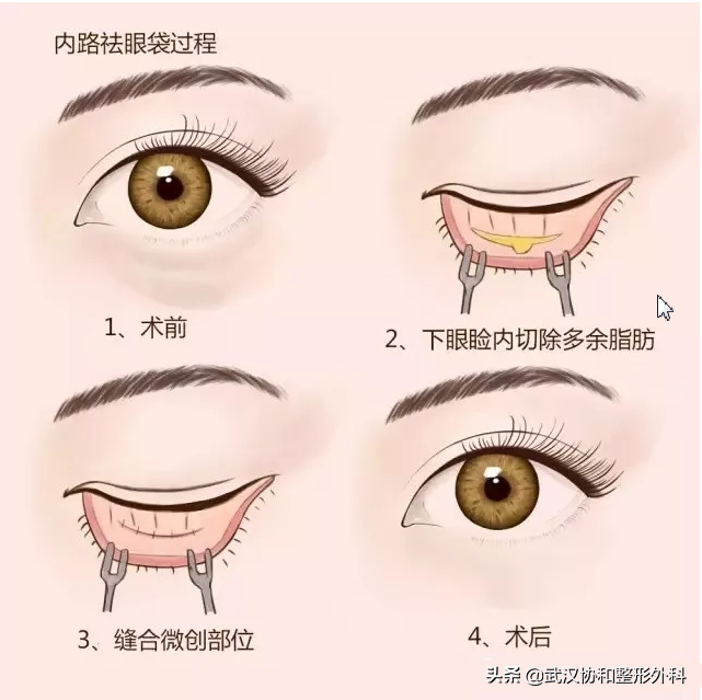內切口是從結膜囊部進入,打開后可把多余的脂肪組織去掉,從而達到去眼袋的果,比較適合較為年輕,皮膚松弛程度不高的求美者。