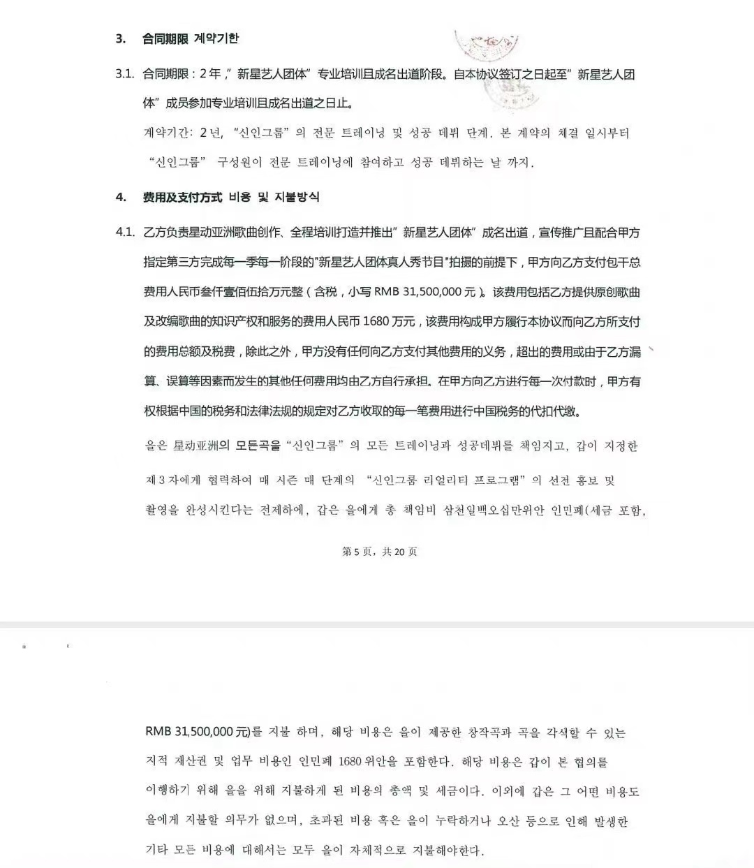 對方氣急之下曬出了蔡徐坤等練習(xí)生簽訂的培訓(xùn)合同,從中可以看出該合同于2016年1月8日簽訂,依海文化公司支付了3150萬元,用于打造并推出“新星藝人團(tuán)體”。