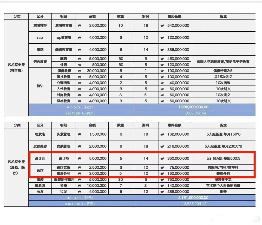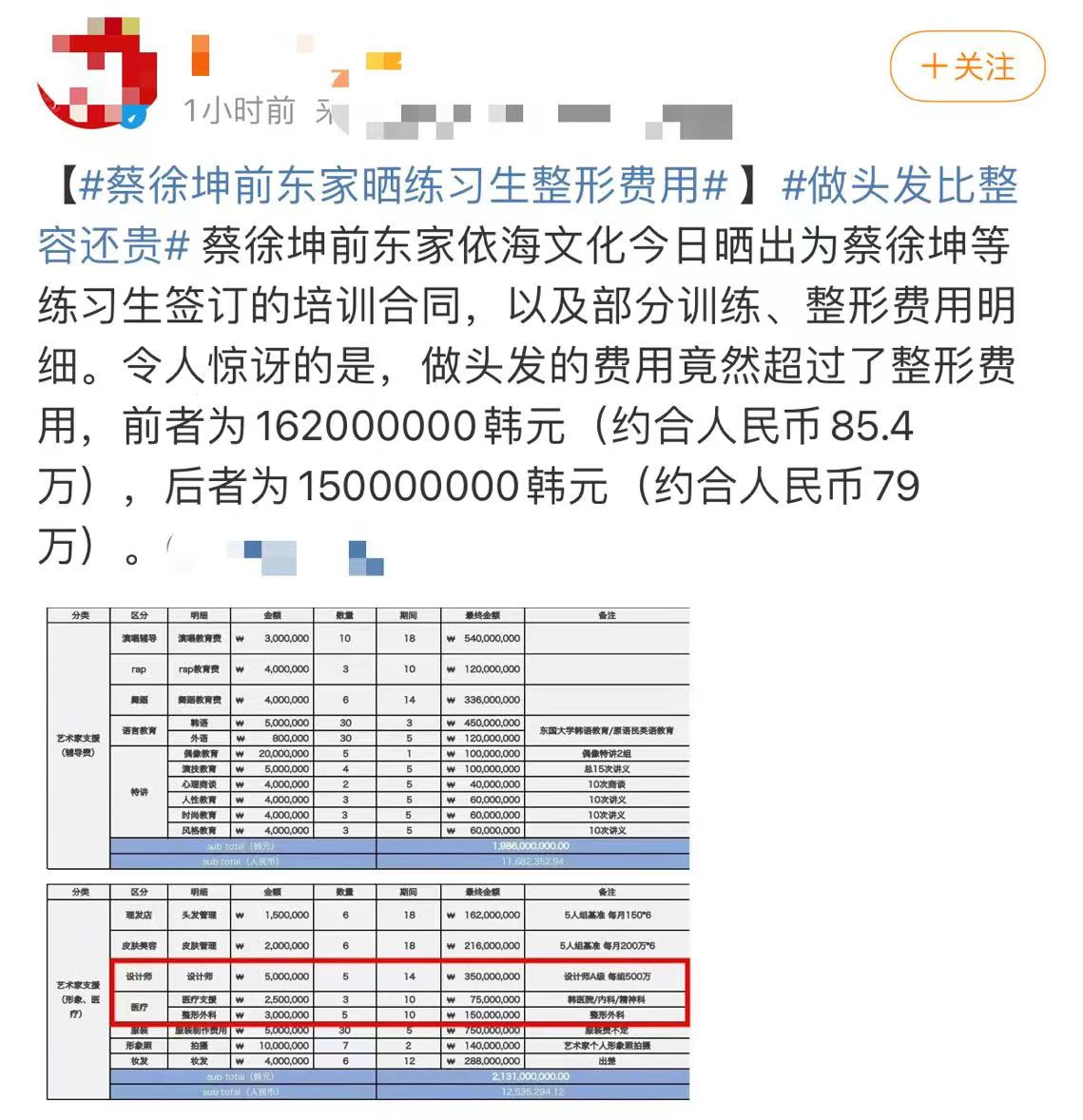 從這張表格中可以看出,蔡徐坤等練習(xí)生在公司期間一共花費(fèi)了1.5億韓元(約79萬元人民幣)用于整形外科,皮膚美容也花費(fèi)了2.6億韓元(約136.8萬元人民幣)。