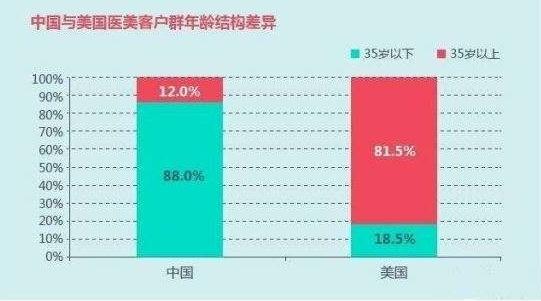 來(lái)自前瞻產(chǎn)業(yè)研究院的數(shù)據(jù)分析顯示,在醫(yī)美市場(chǎng)成熟的美國(guó),消費(fèi)群體主要在35歲以上,約占80%且滲透率超過(guò)13%;而在中國(guó),35歲以上消費(fèi)群體占比約為12%,而滲透率更是低至0.2%。通常來(lái)講,35歲以上女性消費(fèi)能力更強(qiáng)、思想更成熟理性。