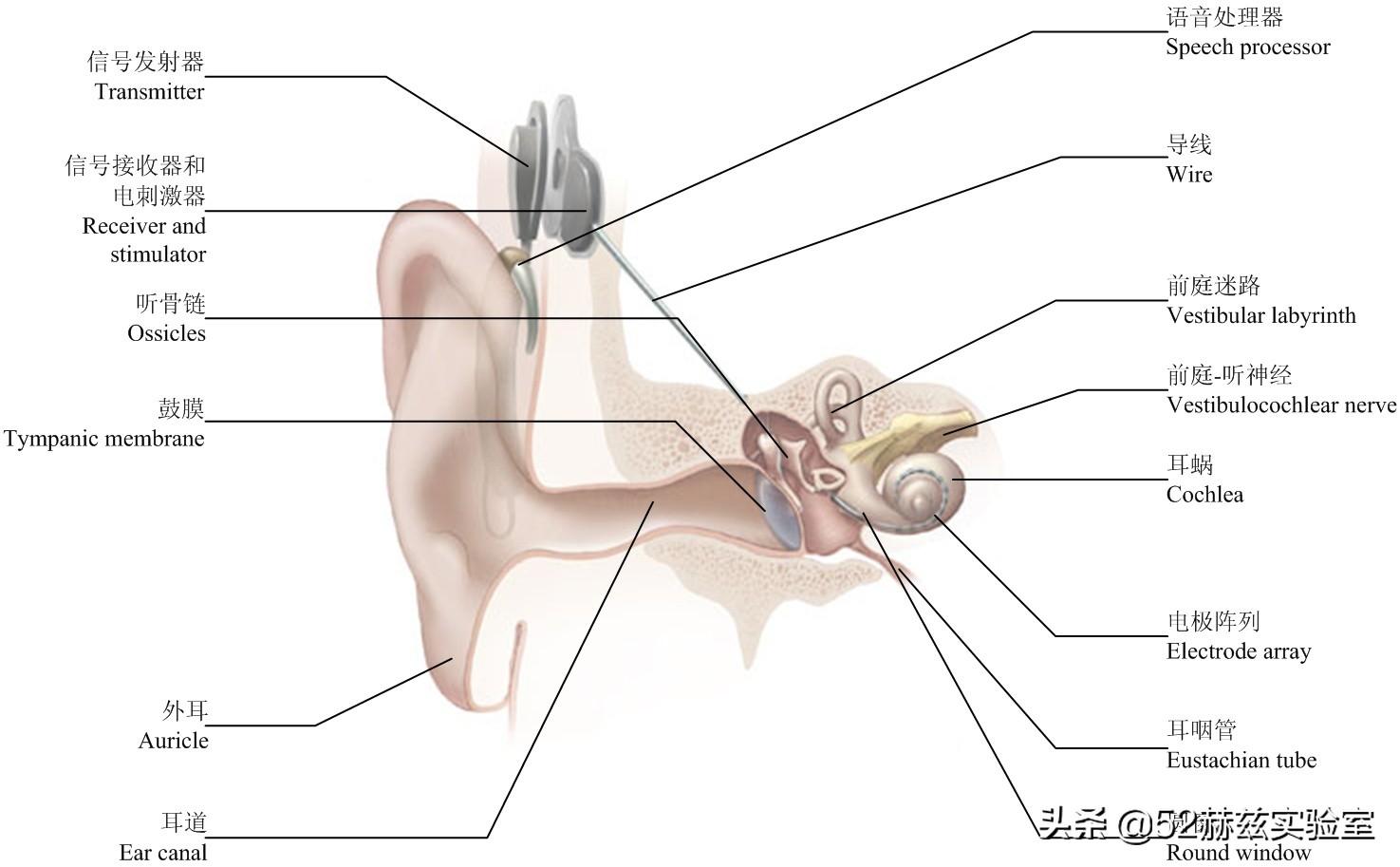 聲音首先傳到我們的耳朵,和藏在耳后的聲音處理器,處理器上的麥克風(fēng)接收聲音,然后將聲音轉(zhuǎn)化為電子信息。