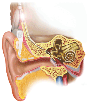 植入體部分經(jīng)手術(shù)植入體內(nèi),電極穿入耳蝸的鼓階內(nèi),模擬人體耳蝸功能,而體外機(jī)的言語處理器一般掛在耳背上,體外機(jī)的傳輸線圈和植入體的接收線圈通過磁鐵吸附在一起。