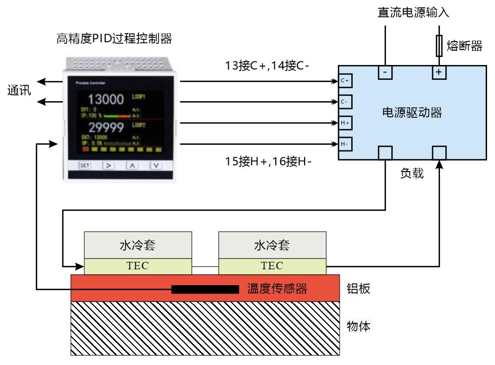 針對(duì)上述對(duì)TEC溫控裝置的技術(shù)要求,本文提出了一種高性?xún)r(jià)比的解決方案。解決方案的具體內(nèi)容是采用模塊式結(jié)構(gòu),以24位AD和16位DA超高精度PID控制器作為基礎(chǔ)單元,采用分立模塊式電源驅(qū)動(dòng)器。此解決方案可根據(jù)不同應(yīng)用場(chǎng)景選擇不同功率的電源驅(qū)動(dòng)器,配合PID控制器可實(shí)現(xiàn)靈活的組合和應(yīng)用,并配合隨機(jī)軟件可以方便快捷的進(jìn)行可編程溫度控制。