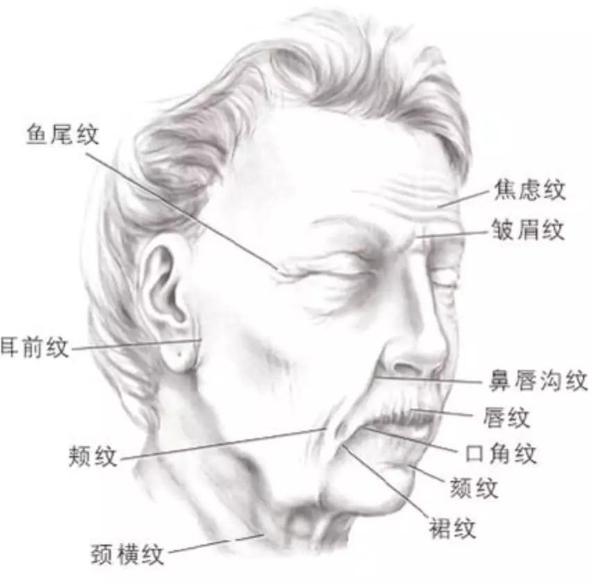 除了法令紋,隨著衰老還會(huì)出現(xiàn)魚尾紋、眉間紋、川字紋、抬頭紋、頸紋等等…如果要細(xì)細(xì)數(shù)的話,大概有20多種。