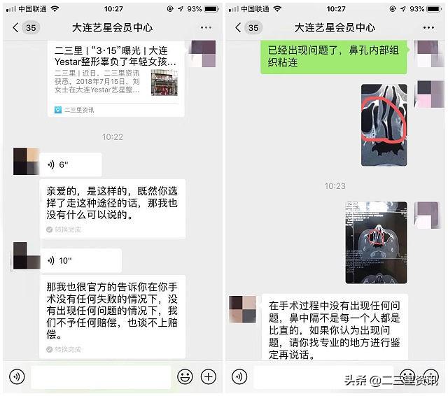 日前,二三里資訊報(bào)導(dǎo)了一篇關(guān)于劉女士在大連Yestar整形后發(fā)生醫(yī)患糾紛的新聞。劉女士術(shù)后恢復(fù)期間鼻部出現(xiàn)多處異常問題,與該院多次協(xié)商賠償未果。二三里資訊在曝光此事后,劉女士收到大連Yestar整形給出的這般答復(fù)。