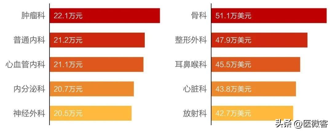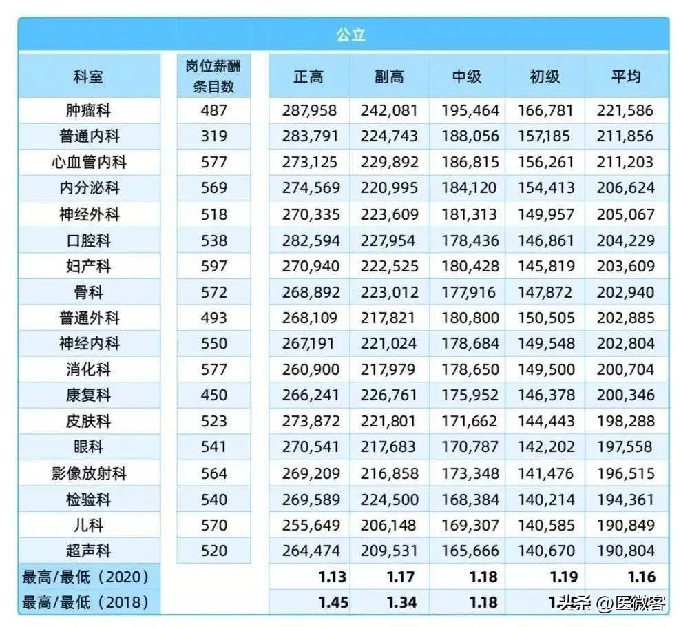 數據顯示,2020年中國醫(yī)院員工薪酬平均約19.7萬元,其中公立醫(yī)院整體薪酬水平較民營醫(yī)院高出約三成。而醫(yī)療界平均收入高的五個科室為腫瘤科、普通內科、心血管內科、內分泌科、神經外科。