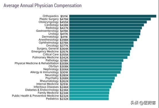 2020年5月,美國醫(yī)學網站Medscape公布了美國《2020年醫(yī)生薪酬報告》(Medscape Physician Compensation Report 2020)。該報告的數據在2020年2月10日前收集完成,共來自30多個??频?.7萬余名醫(yī)生提供了自己的收入數據。