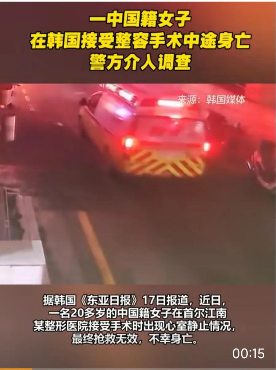 #中國女子在韓國接受整容手術(shù)時身亡#據(jù)韓國《東亞日報》17日報道,近日,一名20多歲的中國籍女子在首爾江南某整形醫(yī)院接受手術(shù)時出現(xiàn)心室靜止情況,終搶救無效,不幸身亡。