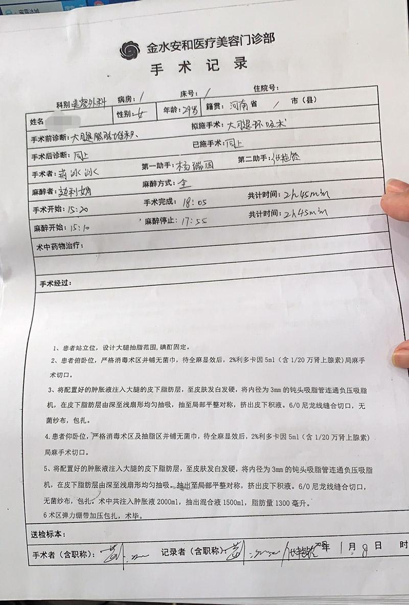10月26日,小夢(mèng)向猛犸新聞·東方今報(bào)記者講述經(jīng)歷:2020年1月8日,她花費(fèi)2萬元在鄭州市安和醫(yī)療美容門診有限公司(下稱“安和整形”)做了大腿抽脂手術(shù),3月份左腿局部開始出現(xiàn)積液,后來鼓起乒乓球大的包,4月26日返回安和整形調(diào)節(jié)24天不見好轉(zhuǎn)。