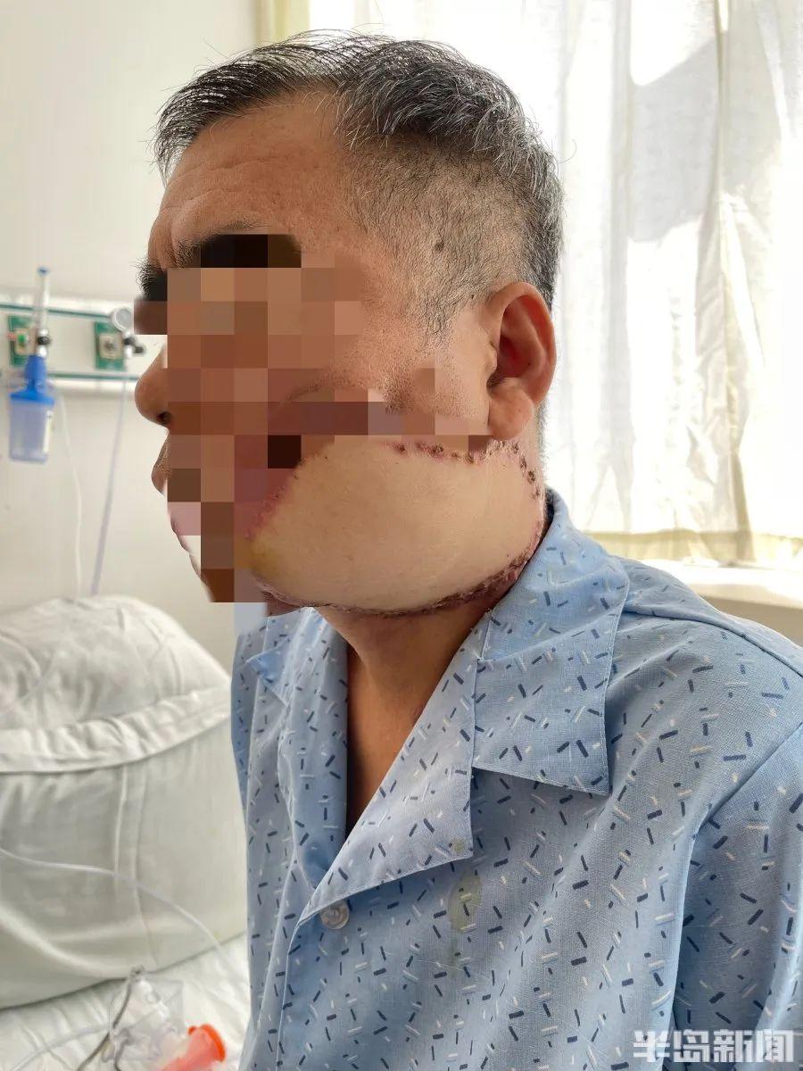 9月24日,記者在青大附院口腔頜面修復重建科西海岸院區(qū)病房見到56歲的趙全智(化名)時,他已經(jīng)可以下地行走,見到記者,他激動,眼含熱淚,嘴里不停說著:“現(xiàn)在終于能張開嘴了,吃進去飯了,之前感覺分分鐘就會結(jié)束生命,是郅克謙主任救了我?!?