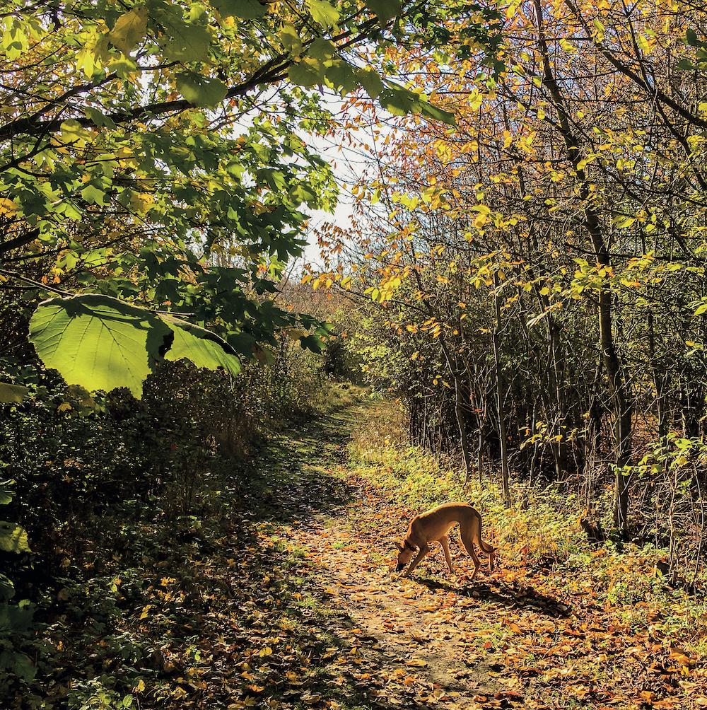 安妮是一只10個月大的小勒車犬,我從動物救助站領(lǐng)養(yǎng)了它。安妮是我散步的好伙伴。它有一身太妃糖色的毛發(fā),四肢細(xì)長,喜歡奶酪和獾的便便,熱愛森林。如果早餐后我忙著工作無法脫身,它就會不開心地嗚咽,叼著牽引繩在客廳里跑來跑去,然后把鼻子塞進(jìn)我的雙手和鍵盤間,阻止我繼續(xù)打字。安妮特別喜歡和我一起早上出門遛彎。在樹林里,我悠閑地觀察瓢蟲,或者拍下樹籬邊的竊衣,它在一旁不知疲倦地巡邏:檢視有松鼠打鬧的樹木,嗅聞麂子穿過樹籬的地方(動物穿行后在樹枝和樹叢中會留下小縫隙),銜起落葉,翻啃爛蘋果,把狐貍的糞便抹在自己身上。安妮完全沉浸在樹林中,好像被自己的狼類祖先所附身,它汲取著每一種氣息,盡可能讓自己的身體沾染上這些氣味。
