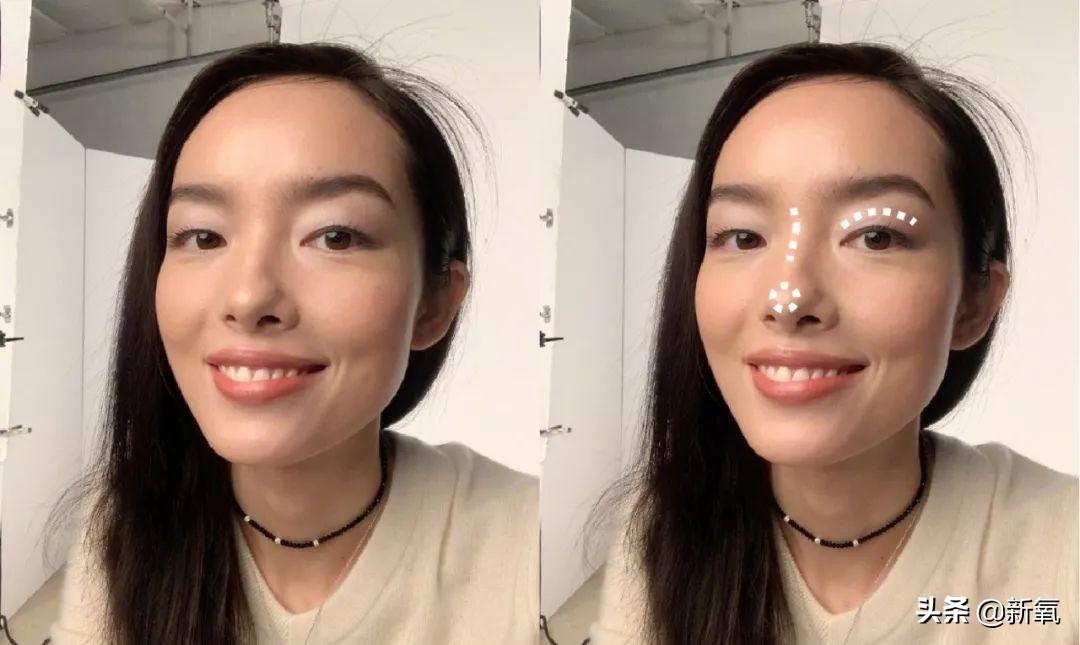 不過(guò)要注意避免通天式的深重鼻影,重點(diǎn)在于加深眼窩+突出鼻頭。白色尖頭指的地方鼻影可以不那么重,營(yíng)造一點(diǎn)自然轉(zhuǎn)折感。