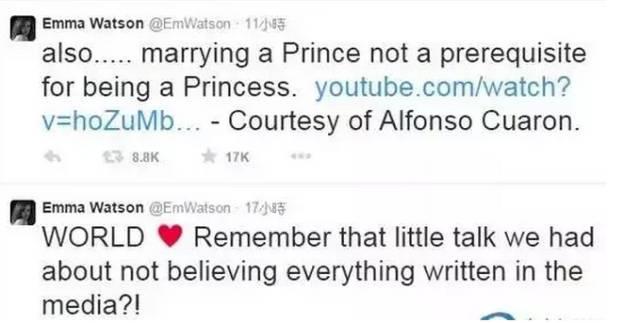 不過,艾瑪?shù)故堑谝粫r間在推特否認(rèn)了這個傳言,并表示:“要成為公主,并不一定得嫁給王子。每個女孩都是公主。