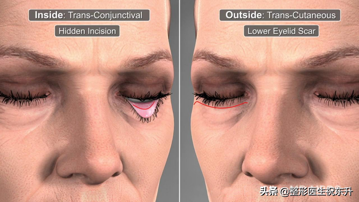 主要適用于眼袋皮膚緊致,僅有脂肪膨隆的人。是下瞼的瞼結(jié)膜上做一個(gè)手術(shù)切口,然后通過這個(gè)切口,將過多的眶隔脂肪切除,從而起到矯正下眼袋的目的。