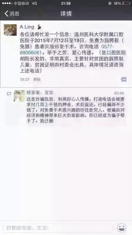 溫州網(wǎng)訊 “在溫免費(fèi)為唇腭裂患者實施修復(fù)手術(shù)”這則信息這兩天在微信朋友圈大量轉(zhuǎn)發(fā),隨后有網(wǎng)友評論說:這是詐騙信息,打進(jìn)電話會被要求付預(yù)約押金,已有人上當(dāng)受騙。這到底怎么回事?溫醫(yī)大附屬口腔醫(yī)院昨天專門就此事召開新聞發(fā)布會辟謠:免費(fèi)手術(shù)是真的,此活動不收費(fèi),如遇要求付預(yù)約押金的可判斷是詐騙。