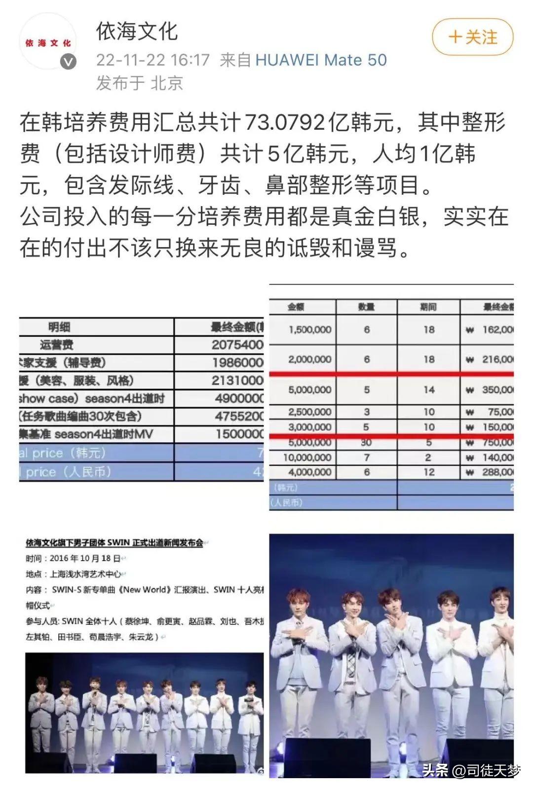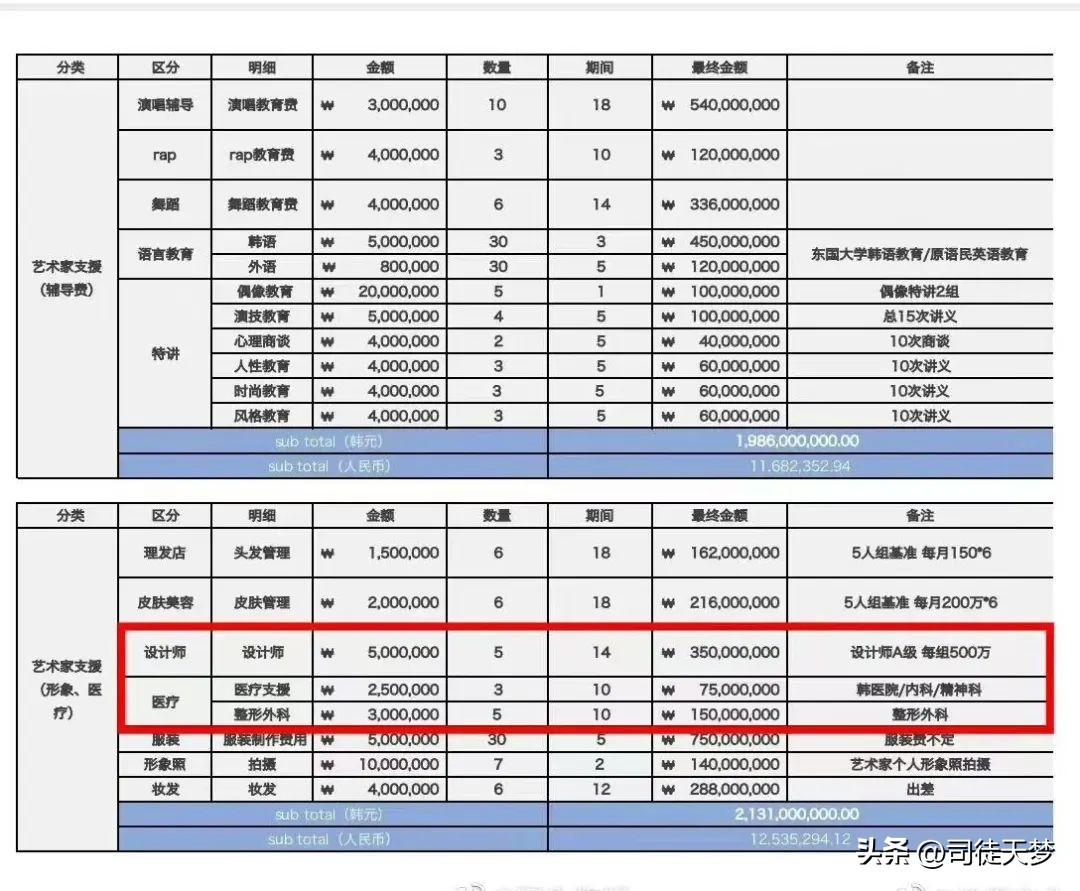 其中整形費(fèi)大約5億韓元(265w人民幣),人均花費(fèi)1億韓元(相當(dāng)于50.4w人民幣)項(xiàng)目包括發(fā)際線、鼻子、整牙等。