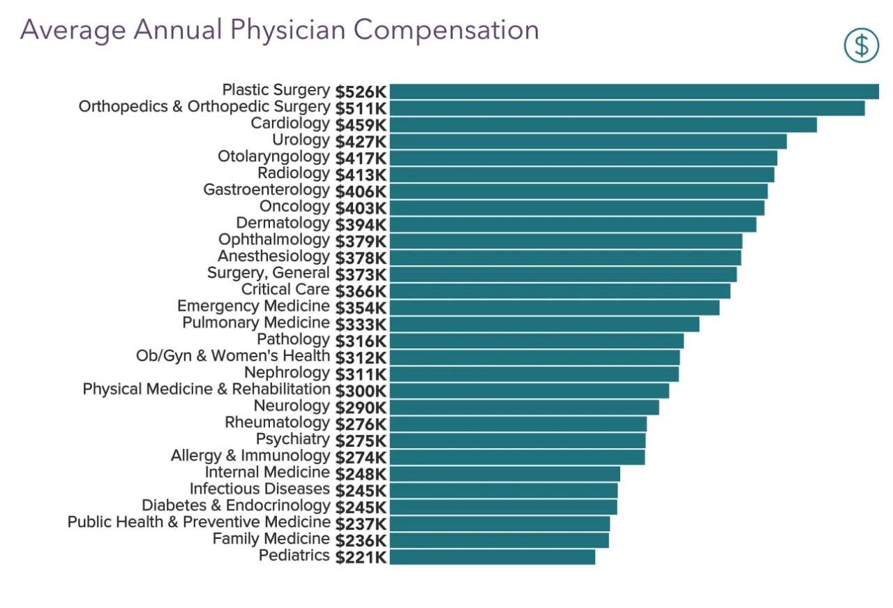 美國(guó)醫(yī)學(xué)網(wǎng)站Medscape也公布了美國(guó)《2021年醫(yī)生薪酬報(bào)告》。報(bào)告顯示,骨科和心臟科醫(yī)生的年收入連續(xù)7年位列??漆t(yī)生年收入榜前五。TOP5??品謩e是:整形外科、骨科、心臟科、泌尿科、耳鼻喉科2020年,整形外科醫(yī)生以52.6萬美元的年收入排在第一,其次是骨科醫(yī)生(51.1萬美元)。公共衛(wèi)生與預(yù)防醫(yī)學(xué)、家庭醫(yī)生、兒科連續(xù)三年都在低位。