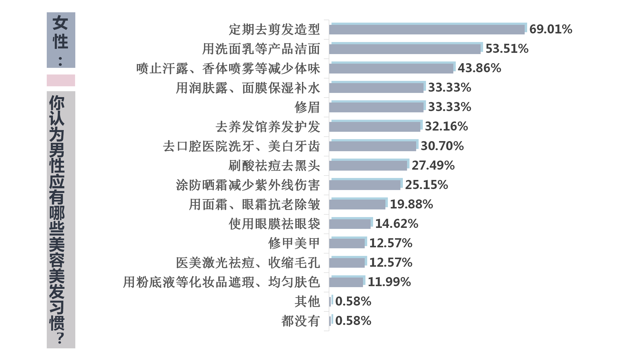 同男性的選擇一樣,許多女性均認(rèn)為男生定期剪發(fā)、做造型和潔面的習(xí)慣是為重要的,分別占比69.01%、53.51%。在男生看來(lái),優(yōu)先級(jí)排第三的是到養(yǎng)發(fā)館做頭發(fā)護(hù)理,但43.86%的女生卻認(rèn)為男生體味大,應(yīng)該優(yōu)先用止汗露、香體噴霧等解決體味問(wèn)題,接著是修眉(33.33%)、用潤(rùn)膚露和面膜做好臉部保濕補(bǔ)水工作(33.33%),然后才是頭發(fā)護(hù)理工作(32.16%)。