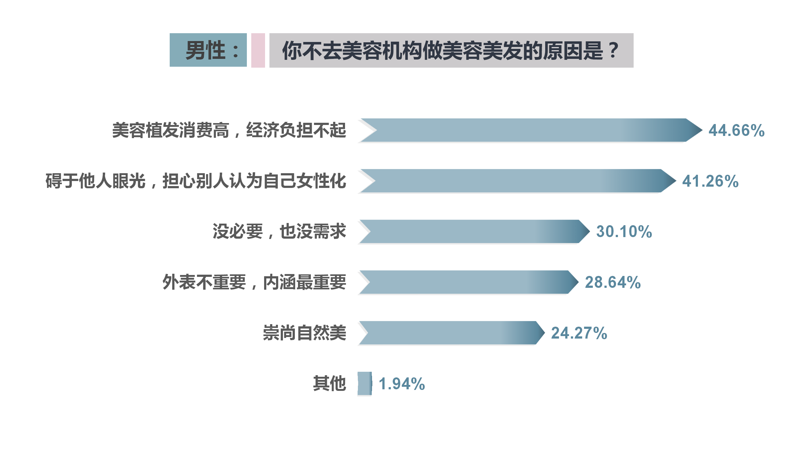 值得注意的是,本次調(diào)查中也有24.4%的受訪者沒(méi)有去過(guò)美容機(jī)構(gòu)。談及原因,44.66%的男性認(rèn)為美容消費(fèi)過(guò)高、經(jīng)濟(jì)負(fù)擔(dān)重是主要因素;另外公眾觀念也是阻礙男性美容消費(fèi)的重要原因,41.26%的男性受訪者擔(dān)心自己去美容機(jī)構(gòu)會(huì)被認(rèn)為“娘化”。